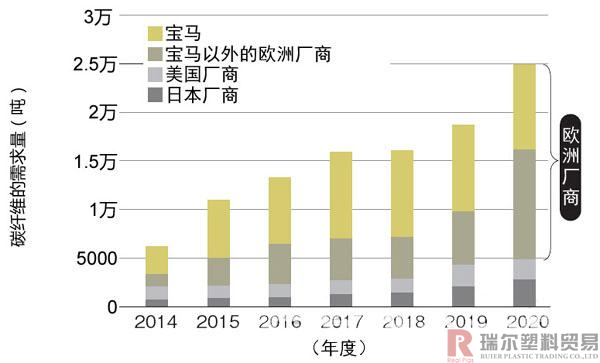 三菱丽阳常务执行董事山本岩表示,主要需求来自欧洲汽车厂商。该公司已经为德国宝马的纯电动汽车“i3”等提供了大量碳纤维原料,并且i3是全球首次采用碳纤维增强树脂基复合材料(CFRP)骨架的量产车。2013年的供货量约为6000吨(换算成碳纤维后,将近3000吨),2016年计划增加到约2万吨(换算成碳纤维后,将近1万吨)。宝马以外的欧洲各大汽车厂商也将陆续在每年2万~5万辆生产规模的量产车上采用CFRP,其目的是应对2020年更加严格的欧洲燃效规定(二氧化碳排放量规制)。